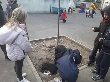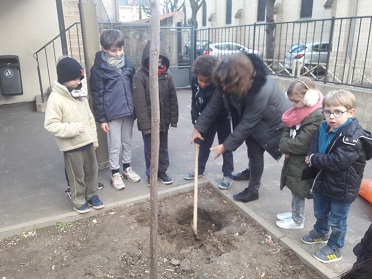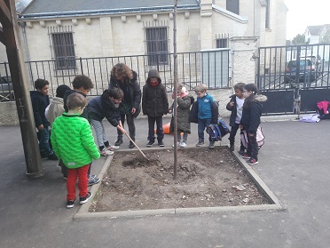 Après les arbres (CATALPA) plantés pendant les vacances de février, les bancs installés le mercredi 20 mars, place aux plantations de fleurs pour poursuivre l'embellissement de la cour!