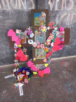 | En fin d'après midi, nous nous sommes tous retrouvés dans la cour sous la mosaïque et autour du Père Thierry afin de célébrer et de chanter tous ensemble ce mois de Marie. | ||